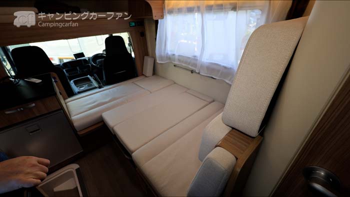 ダイネットを展開したベッドは、1900x1050mmの大きさ。2名が就寝できる。オプションの追加マットを通路部に設置すると、1900x1300mmの大きさになる。これは家庭用ではセミダブルベッド以上の幅で、2名がゆったりと就寝できる。