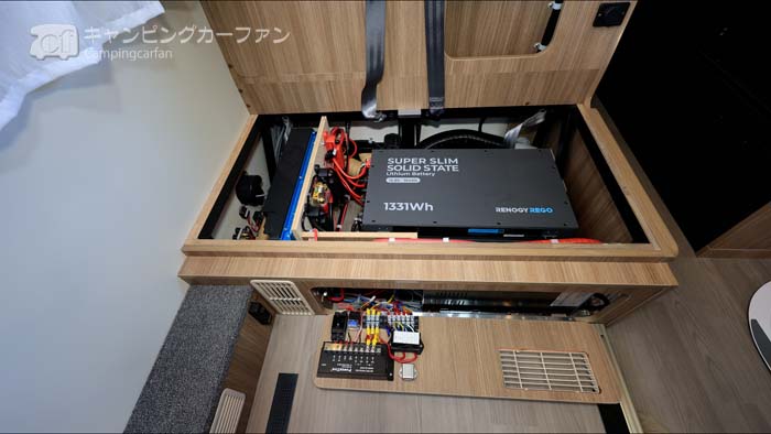 家庭用エアコンやリチウムイオンバッテリーはもちろん、800Wの大容量ソーラーシステムまで標準装備。多目的ルームでは温水シャワーまでもオプションで設置できる。安全性の高い個体リチウムイオンバッテリー(正確には準個体)を採用しているのも特徴だ。