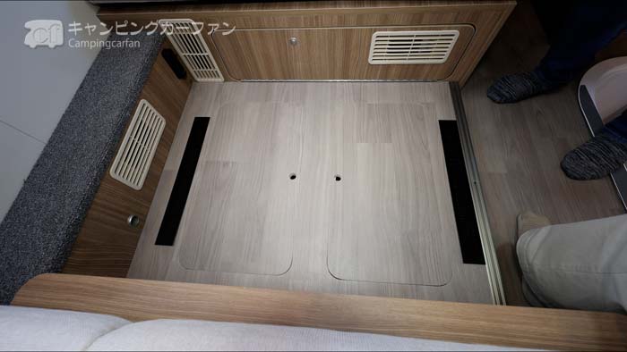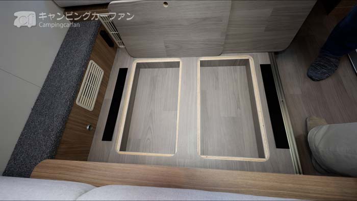 更に、後部ベッドのウッドスプリングやFFヒーターの吹き出し口、ダイネットの床下暖房やランバーサポート、ラダー不要のバンクベッドなど、有用なアイデアも多数採用されている。