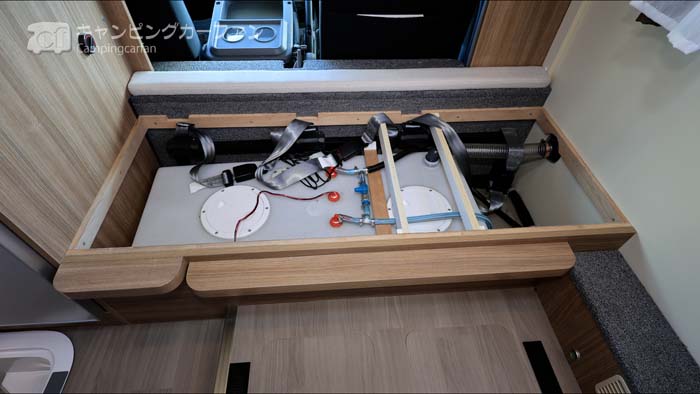 ギャレーキャビネット以外の収納では、ダイネット上部のオーバーヘッド収納、ダイネットの床収納、冷蔵庫上部の引き出し収納、シューズボックス、 後部ベッド下収納、外部収納があり、充実した収納となっている。