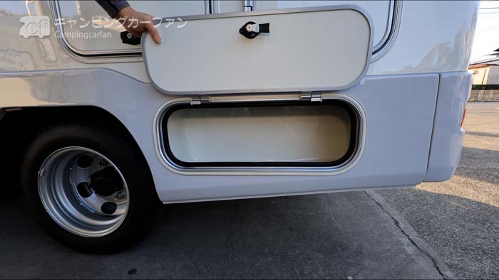 後部のベッドの下は大きなトランクになっている。左サイドと後部からアクセスできる。後部ドアはオプションで大型に変更可能。サイクルキャリアを付ける場合は標準の小型のドアのままとなる。