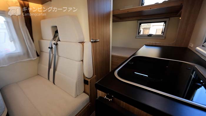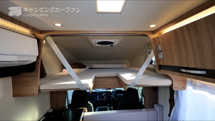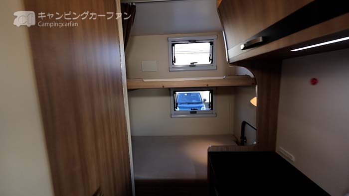 中央にベッドマットをはめ込むと1900x1850mmの大きさになり、これは家庭用ではキングサイズベッドの幅(1800mm)以上だ。バンクベッドにも左右に読書灯、常夜灯、USB電源コネクタが用意されている。アクリル2重窓は右側のみ標準装備、左側はオプションで設置できる。ただし、この場合はサイドオーニングは付けられない。