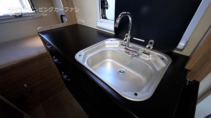 20Lの給排水タンクは車外から出し入れが可能だが、オプションで温水セット(ギャレーのみ)を付けることもできる。オプションで温水が使えるのもハイグレードな設定だ。