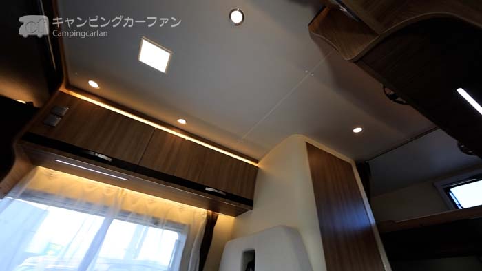 照明は間接光とスポットライトを中心としたお洒落な印象で、多目的ルームなど一部を除いて、全ての照明が調光できる。後部ベッドとバンクベッドの読書灯も調光が可能で、常夜灯も用意されている。
