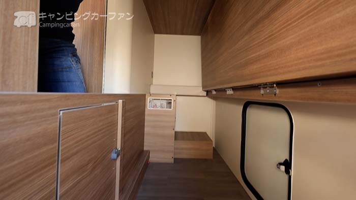 下段ベッドを跳ね上げてロックすると、更に高さのある収納になり、左サイドの縦長のドアから小型の自転車等を積み込むことができる。