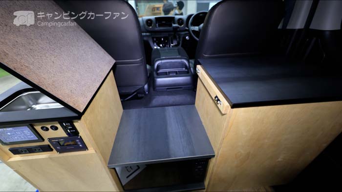 ギャレーキャビネットの中央は跳ね上げられるようになっており、運転席、助手席から後部への移動がしやすくなっている。