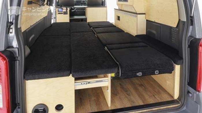 ソランのインテリアも洗練されたものだが、こちらはカジュアルな高級感を持っている。3列目シートには乗車できないので3名が前向き乗車で、ベッドは全体的に1830x1500mmで3名が就寝できるので、ファミリーにも対応する。