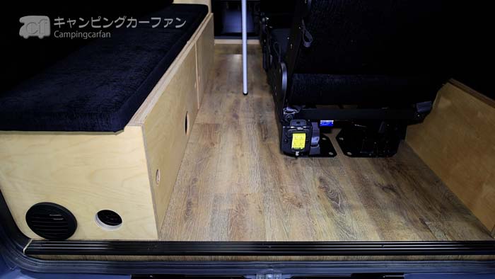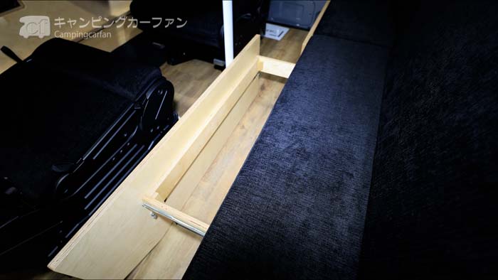 ベッドの項で触れたとおり、ベンチシートの台座を引き出してベッドメークするが、その場合、通路部が収納スペースとして使用できる。