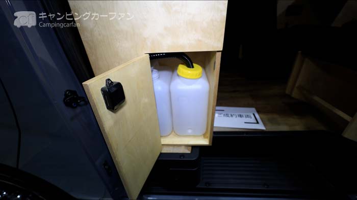 シンクの下には各12Lの給排水タンクが収納されている。車外から直接タンクを出し入れできるので大変便利だ。