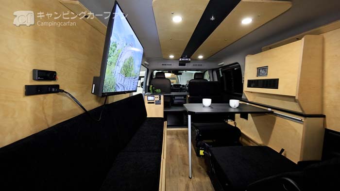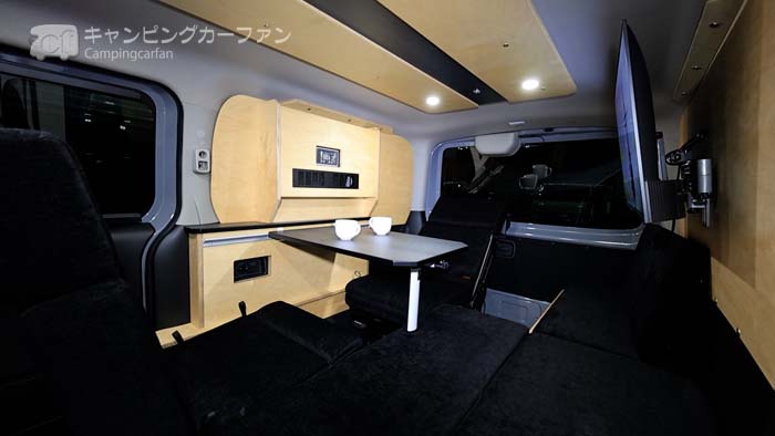 興味深いのは後部両側の窓が全て窓埋めされている点。ダイネットに座って外の景色を眺めるという想定ではないようだ。しかしそれがために大画面テレビを実現できているという面もあり、新たな車内での過ごし方を提案しているともいえる。