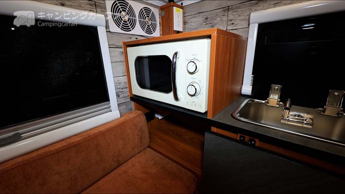家庭用の100V仕様の電子レンジがオプションで設置できる。電子レンジも収納スペースが用意されているので、すっきりと収まっている。ただし、1500W正弦波インバーターはリミテッドパッケージには標準装備されるが、スタンダードパッケージには装備されないので、外部電源があるところでのみ使用できる。