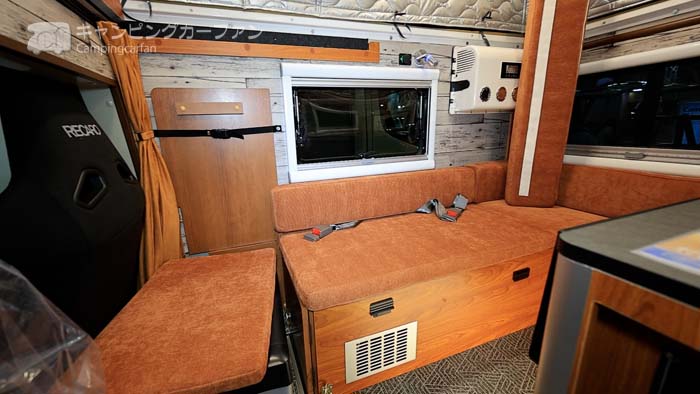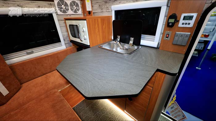展示車はオレンジ色のシートと木目家具、壁面は山小屋風の壁紙、ギャレーの天板はグレーとなっていたが、カラーの選択は可能だろう。照明はLEDスポットライトが中心。ギャレーキャビネットの下に間接照明が設置されている。
