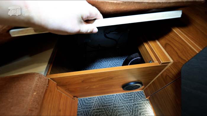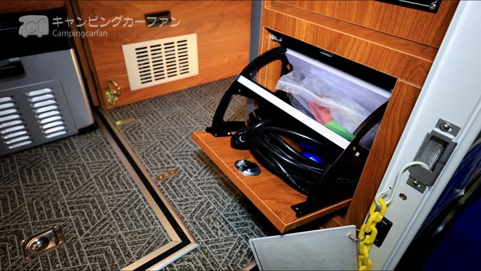 ベンチシートの下は電装系が設置されているが、多少は収納スペースがある。ただし、アクセスし難いため、使い勝手はあまりよくなさそうだ。ベッドモードにする場合も、簡単に通路部に荷物が置けると良いのだが。