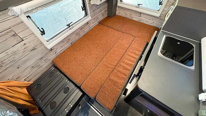 従って、就寝人数は、大人2名+子供2名となっている。ただし、風雨が強くてエレベーションルーフが上げられない場合は、ダイネットベッドで就寝するしかないが、2名で就寝する場合は、かなり狭いことを知っておく必要がある。