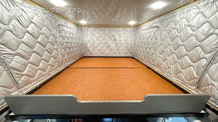 エレベーションルーフを上げることによってできるルーフベッドは、1900x1290mmの大きさ。これは家庭用ではセミダブルベッド以上の幅があり、大人が2名就寝できる。
