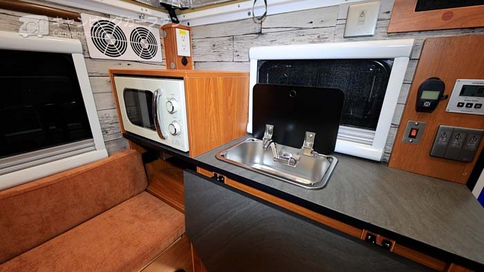シンクのガラス蓋を閉めると広いカウンターになり、対面にはアクリル2重窓があるため、明るいギャレーになっている。シンクの下には各15Lの給排水タンクが収納されている。車外から直接出し入れするのは難しく、テーブルがあるので多少出し入れが面倒かもしれない。