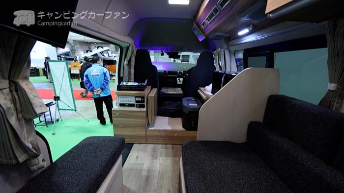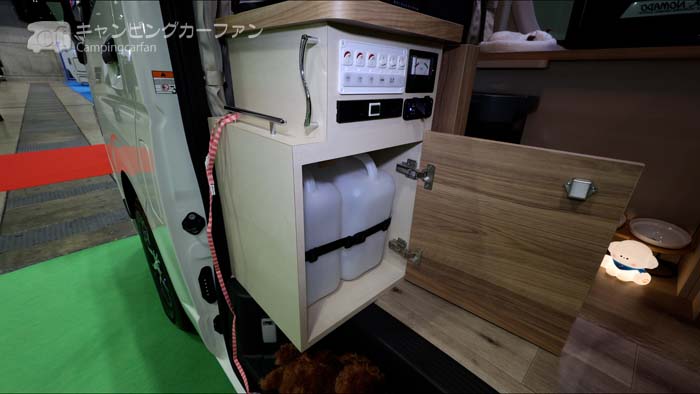 リチウムイオンバッテリーはオプションリストにないが要相談となっており、価格は不明だが400Ahのリチウムイオンバッテリーが搭載できるとのこと。ポータブル電源は車内に設けられた外部電源入力端子に接続して使用する。