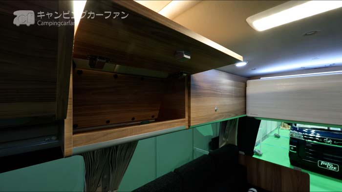 ダイネット上部右サイドにはオーバーヘッド収納が設置されている。アクセスしやすいので、オーバーヘッド収納があると大変便利だ。