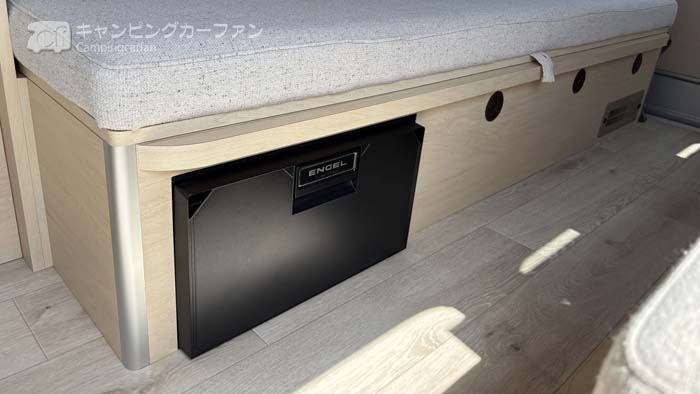 冷蔵庫は30L引出し式が標準装備される。冷凍室が無いので製氷・冷凍と冷蔵が同時にできるものではないが、クルマ旅には必需品なので標準装備は嬉しい。