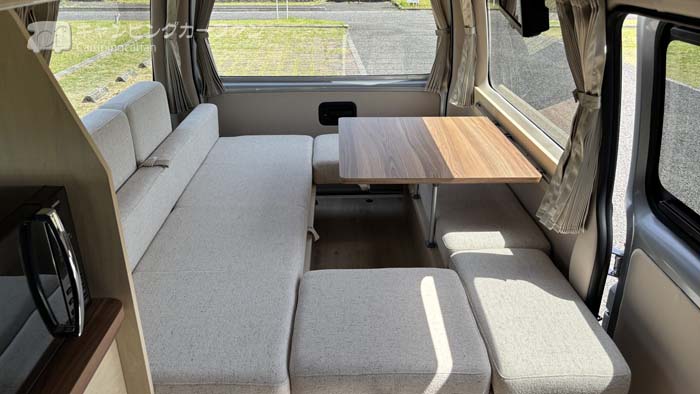 テーブルは比較的大きく、2名なら食事をすることも可能だ。ベッド展開時、このテーブルは後部に収納できる。