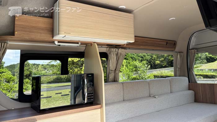 ダイキンの薄型家庭用セパレートエアコン「リソラ」が標準装備される。最新式の薄型エアコンのため多くのキャンピングカーに採用されているエアコンだ。室内機は、標準では上の写真のような設置位置になるが、ベース車のクーラーを移設した場合は、後部に設置される。