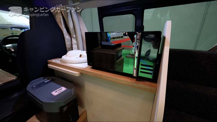 家庭用の100V仕様の電子レンジが標準装備される。インバーターはオプションなので、外部電源が無いところで電子レンジを使いたい場合は、オプションの1500W正弦波インバーターを設置する必要がある。ポータブル電源を積んでいる場合は、これで電子レンジを使用することができる。