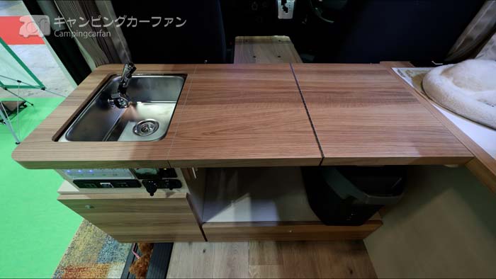 前部のギャレーは車幅方向に設置されているが、運転席、助手席と後部との行き来にテーブルが跳ね上げられるようになっている。更に、同社のオプションとして、ベース車のクーラー(走行時用)を移設(OP)して高さも確保し、更に行き来をしやすくしている。