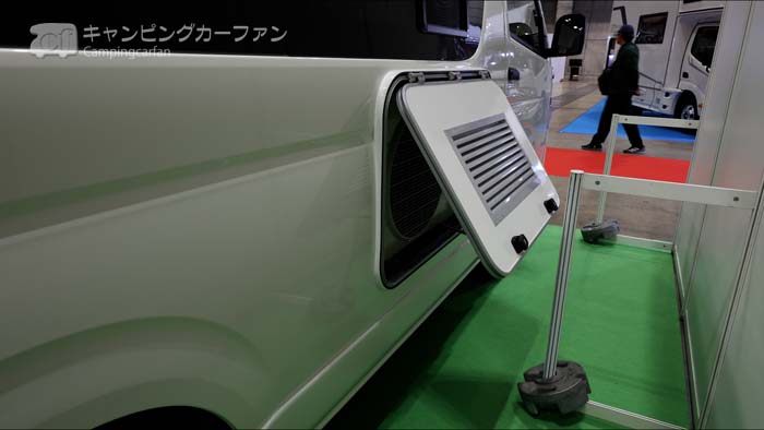 また、スペアタイヤを温存するため、クーラーの室外機を床下ではなくボディ右サイドに設置しているのも特徴となっている。