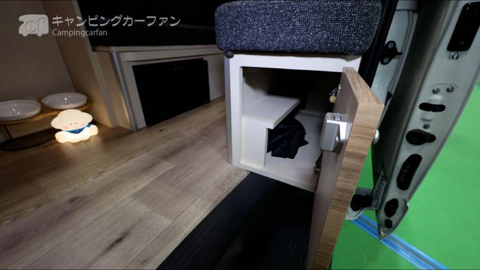 エントランス横にも収納が用意されている。これは左側のベンチシートの前部に当たるが、上部からもアクセスできる。シューズボックスとしても利用できるだろう。