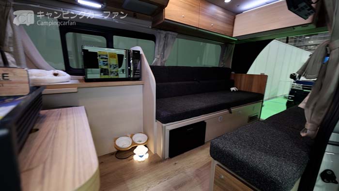 展示車は木目の家具と濃い色のシートの組み合わせだったが、上の写真では明るい色のシートが選択されている。家具色やシート地は選択可能なので、好みのインテリアにできる。