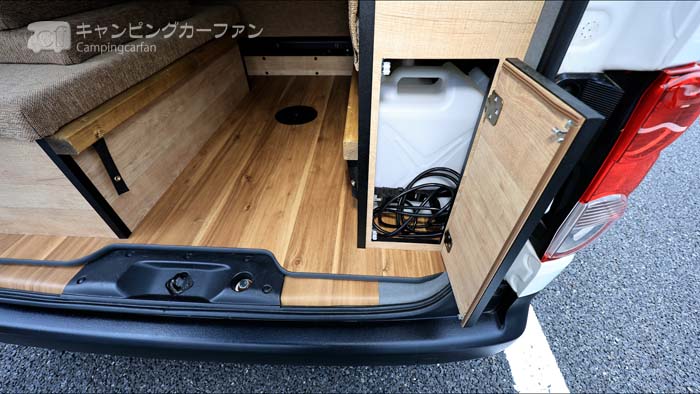 シンクの下には各10Lの給排水タンクが収納されている。リアゲートを開けて車外から直接タンクを出し入れできるので大変便利だ。