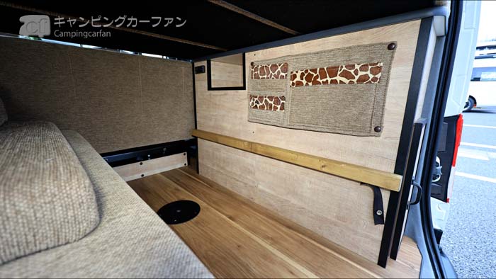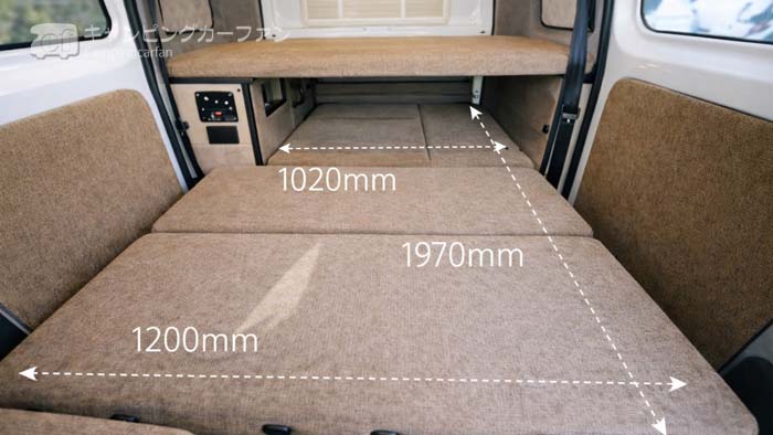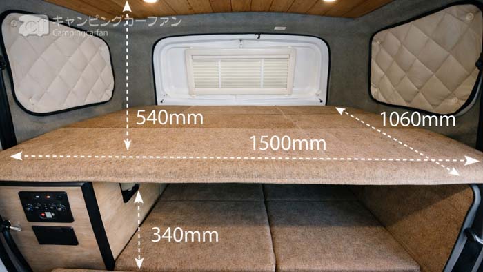 NVホップの優位点は、この上段ベッド。ベッドサイズは1500x1060mmなので子供用ベッドだが、ファミリーで車中泊できるのが大きなメリットだ。上段ベッドボードは標準装備される。
