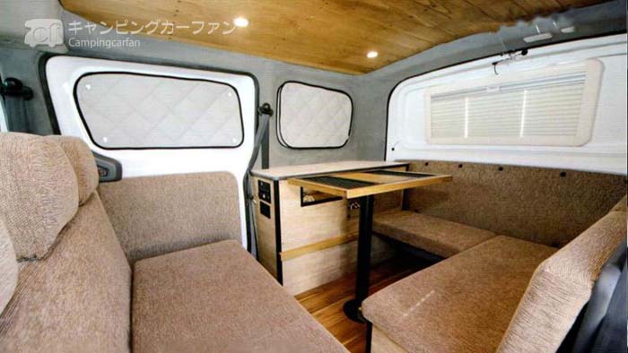 日産NV200バネットをベース車にする8ナンバー登録のコンパクトバンコン。ノーマルルーフで前向きに5名が乗車でき日常用途にも使いやすい。ダイネットベッドでは2名が就寝できるが、上段ベッドで子供も就寝できるため、ファミリーで車中泊ができるのも優位点。