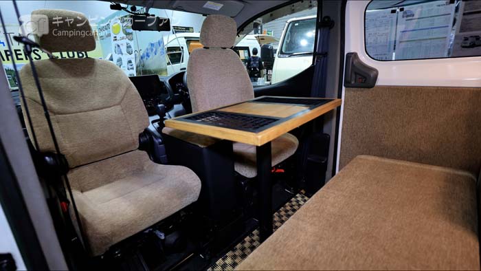 オプションで運転席と助手席を回転して後ろ向きにすることができ、2列目シートは前向きのまま対座ダイネットにすることができる。テーブルの設置も可能だ。フロントシートを有効活用することにより、後部に広いスペースを作ることができる。
