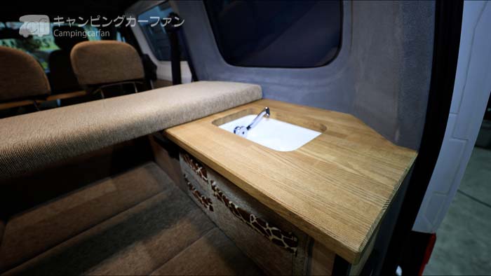 右側後部に設置されているギャレーキャビネットの天板にはシンクとフォーセットが設置されている。調理面もあるので、コンロを置いて調理することもできる。天板も気の温かみのあるもで、高級感がある。