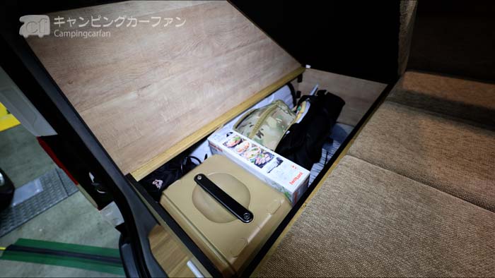 ベンチシート下は大きな収納になっている。ベッドボードを持ち上げる必要があるので、アクセス性は良くないが、頻繁に使わないものを収納しておける。