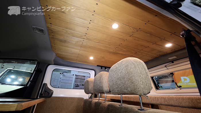 目を引くのはリアルウッドのルーフ。ワンランク上のグレード感を提供している。スポットライトの照明もお洒落だ。家具色やシート地に関しては特に情報は無いが、変更を希望する場合はビルダーにお問い合わせいただきたい。