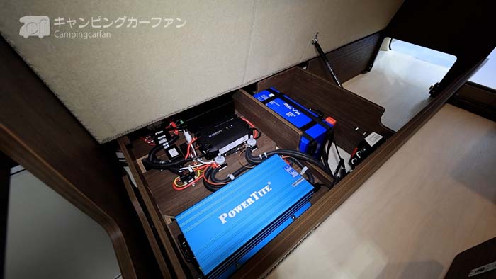 標準仕様では150Ahのリチウムイオンバッテリーが、A/C仕様では300Ahのリチウムイオンバッテリーが標準装備される。その他、走行充電、外部100V電源入力とチャージャーを標準装備。インバーターは、標準仕様では1500W、A/C仕様では2000Wの各正弦波モデルが標準装備される。更に、310W薄型ソーラーシステムも標準装備される。