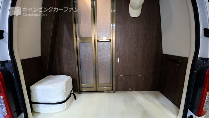 最後部の多目的ルームはドアで仕切られており、完全な個室として使え、ポータブルトイレも標準装備している。
