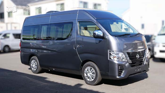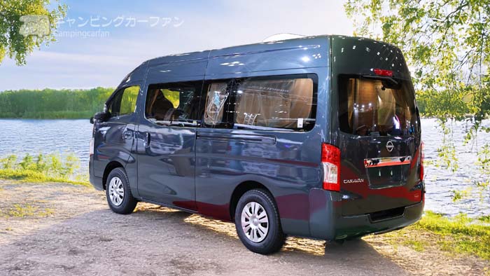 ベース車は日産キャラバン標準幅スーパーロング キャンパー特装車。キャンパー特装車なので、カラードバンパーやメッキグリル、UVカット断熱プライバシーガラス、