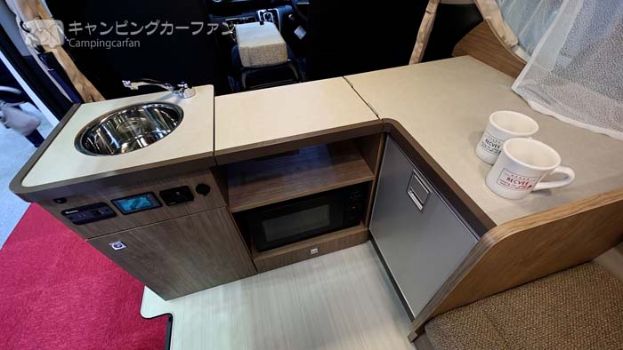 他社モデルでは、日産ピーズフィールドクラフトのブリランテ(917万円~:ガソリン2WD)がある。これはレクビィが製造して日産ピーズフィールドクラフトが販売するモデルだ。これも多目的ルームあり+2名対座ダイネットのレイアウトでイゾラに似ているが、ギャレーは後部の多目的ルーム内にある。