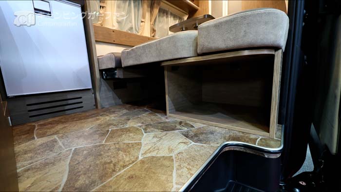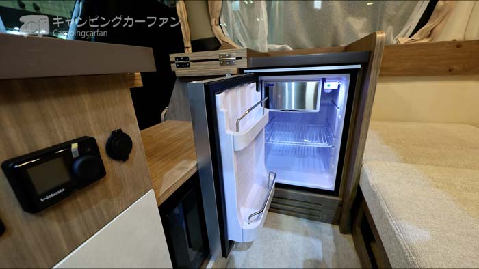 冷蔵庫は49L横開き式が全グレードに標準装備される。冷凍室もあるので、製氷や冷凍食品の保冷と、飲み物や食品の保冷が同時にできる。エントランスの向かいにあるので、スーパーで買った食品を冷蔵庫に入れる場合などは楽にできる。