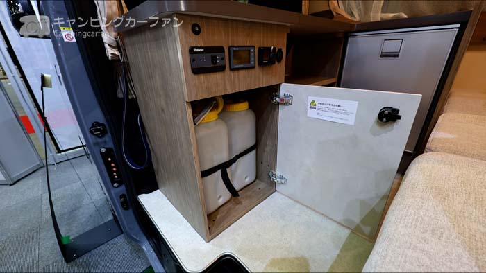 シンクの下には各16Lの給排水タンクが収納されている。車外から直接タンクを出し入れできるので大変便利だ。