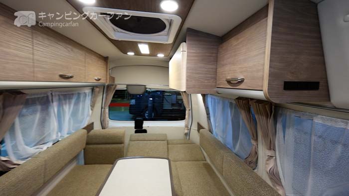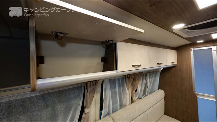 ハイルーフを生かして、ダイネットの上部両側にオーバーヘッド収納が設置されている。高さ、奥行きともに十分で、多くの荷物を収納できる。