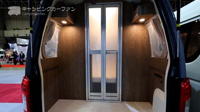多目的ルームありのレイアウトでは、最後部にドアで仕切られた完全な個室が設置される。ラップ式トイレやポータブルトイレを置いて、トイレルームとすることも可能。雨の日や寒い夜に車外に出る必要がなくなる。
