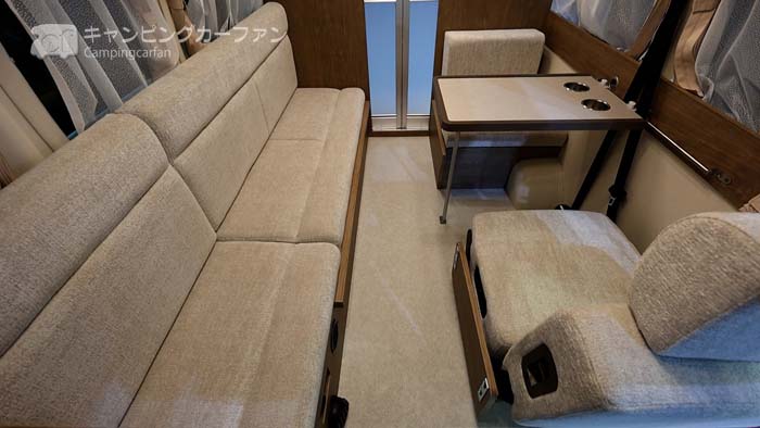 2名対座とベンチシートのダイネットは、同社のプラスLV+1、ソラン/ソランハイルーフ、イゾラなどで使用されているおなじみのスタイル。2列目の単座シートはマルチモードシートで、前向きにすることもできる。