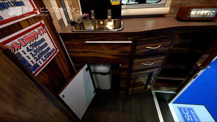 シンクの下には各19Lの給排水タンクが収納されている。車外から直接タンクを出し入れするのは難しいが、エントランスに近いので、出し入れはそれほど苦労しないだろう。車体後部に車外から直接出し入れできるように扉が欲しいところだ。