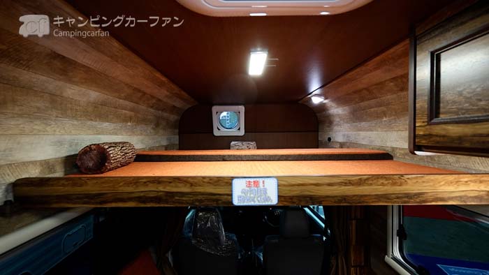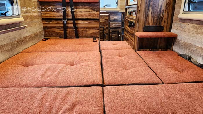 本来ならリアエントランスレイアウトは広いベッドが特徴なので、これは残念なところだが、子供用ベッドとしては十分広いベッドだ。ベッド展開はシートバックを通路部に移動するだけで、簡単に行える。