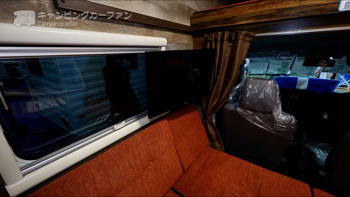 ダイネットのシート形状は、対座+ベンチシートスタイルと、上の写真のような、ベンチシートの横座り対座スタイルの2種類から選択できる。どちらも乗車定員は5名だが、対座+ベンチシートスタイルでは、計4名が前向き乗車できる。