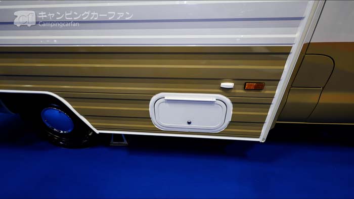 車体右側に外部収納が設けられている。車内に持ち込めない汚れたものやメンテナンス用具などを収納しておくのに便利だ。